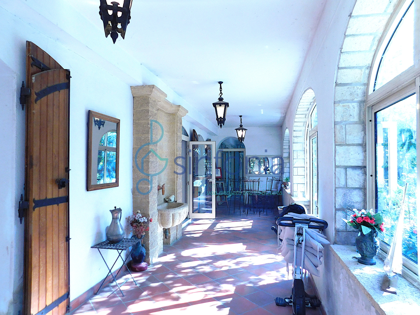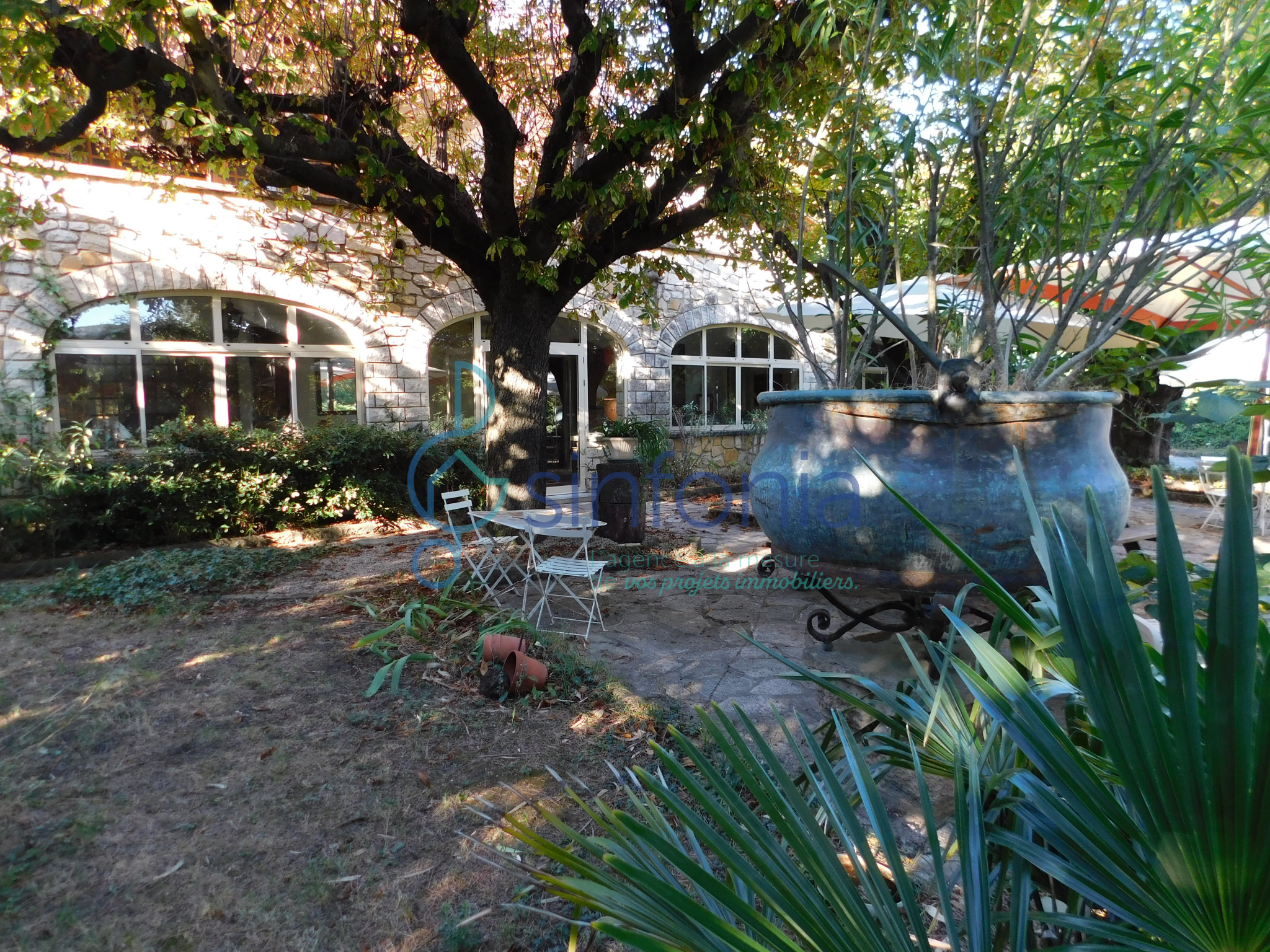 Le terrain végétalisé et entretenu arbore une alléé qui vous aménera à un garage sapcieux de 120 m² et une mezzanine de 70 m² ainsi qu'une cuisine d'été de 15m², avec barbecue et point d'eau, un bassin d'eau avec fontaine et un forage.