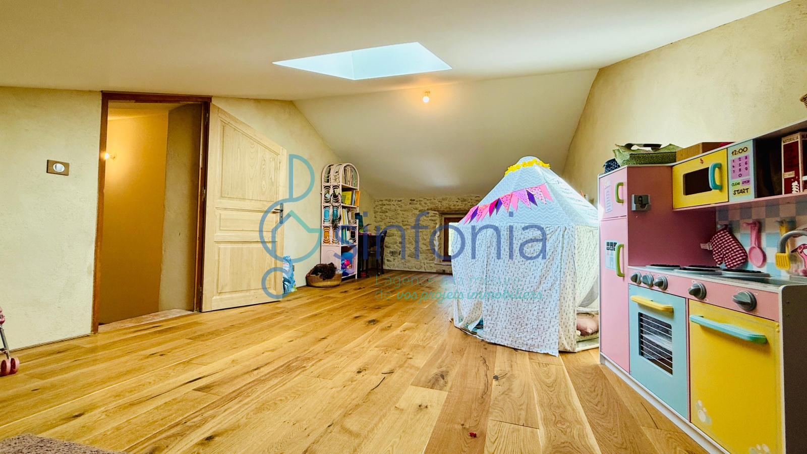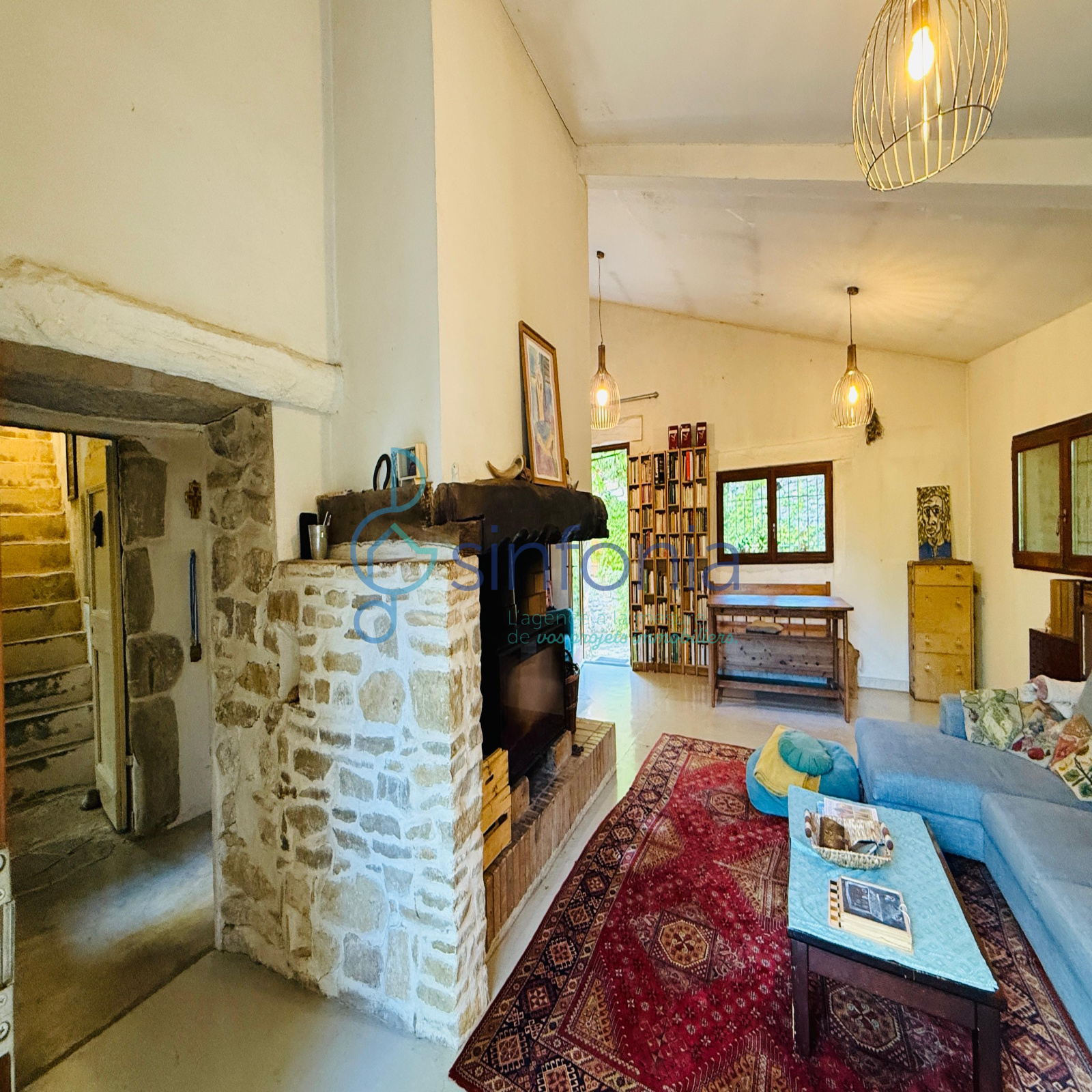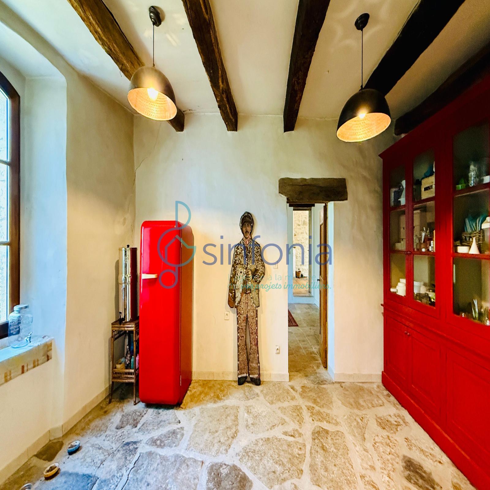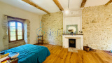 À l’intérieur, chaque détail respire l’authenticité : la chaleur du bois sous les pas, la noblesse des pierres apparentes, les poutres anciennes qui veillent comme des gardiennes du passé. La cheminée trône au cœur du salon, promesse de veillées douces et lumineuses, tandis que les pièces, baignées de lumière, invitent à ralentir le temps.