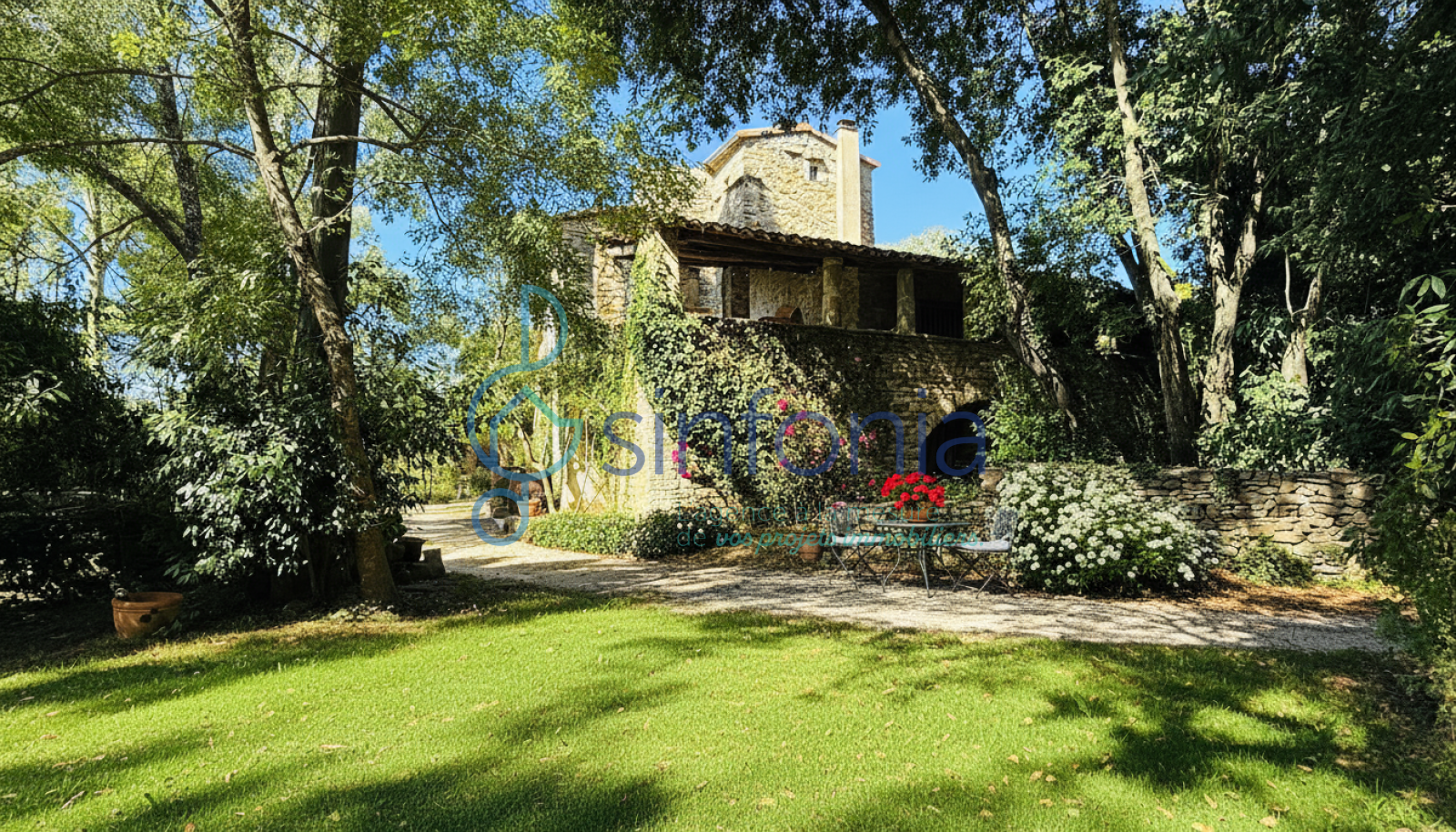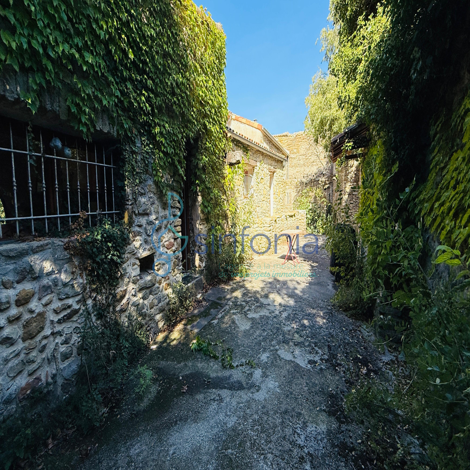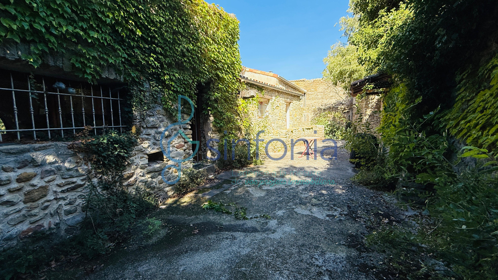 Derrière son portail, la cour dévoile des murs enlacés de vigne et des terrasses secrètes où résonne le chant des cigales. Le jardin, en attente d’un souffle nouveau, se prête aux rêves d’une piscine turquoise scintillant au soleil, d’un verger parfumé ou d’un jardin paysager où partager des soirées d’été inoubliables.( La photo de la piscine est une projection , la propriété n'a pas de piscine mais le terrain est piscinable)