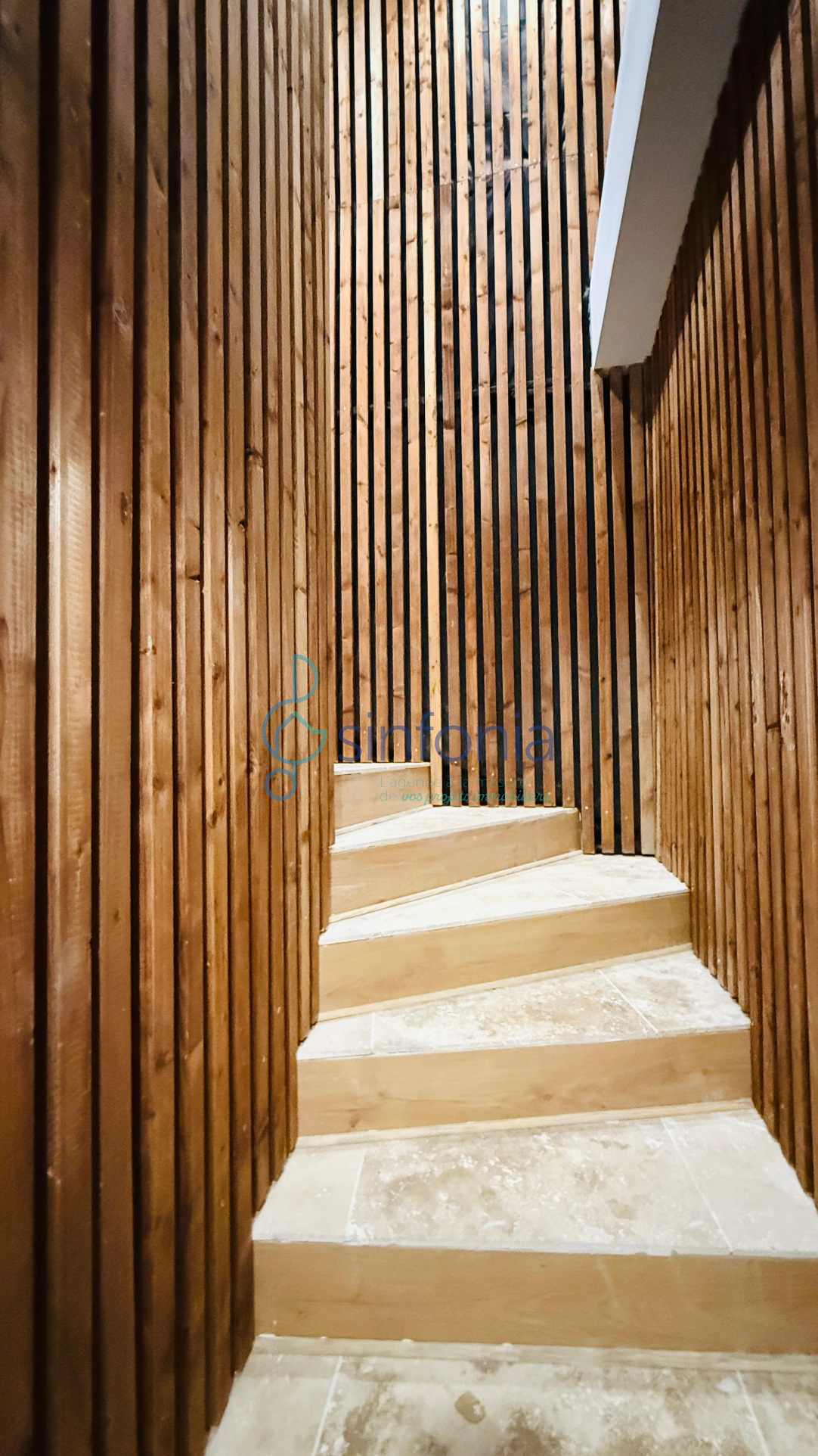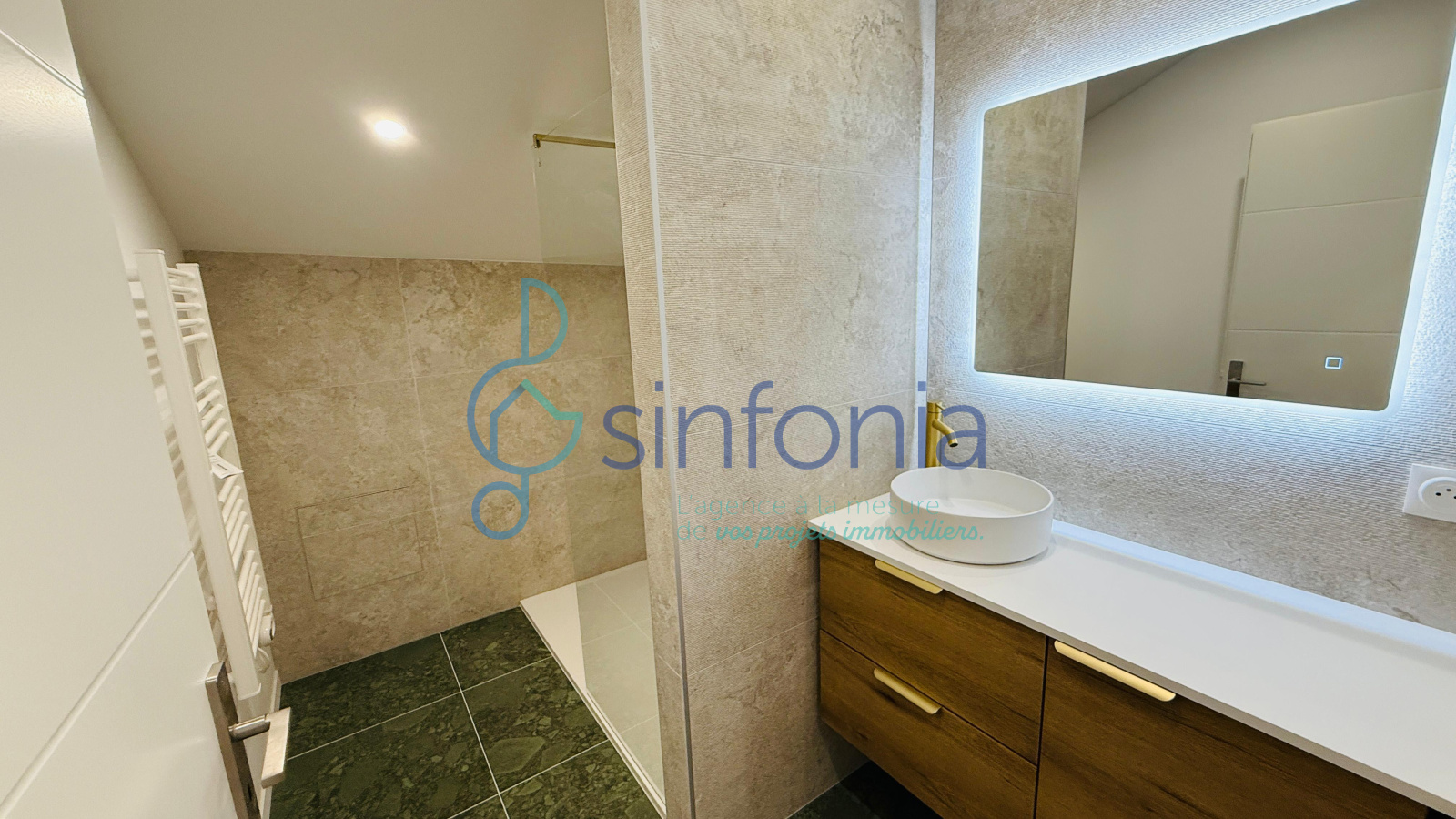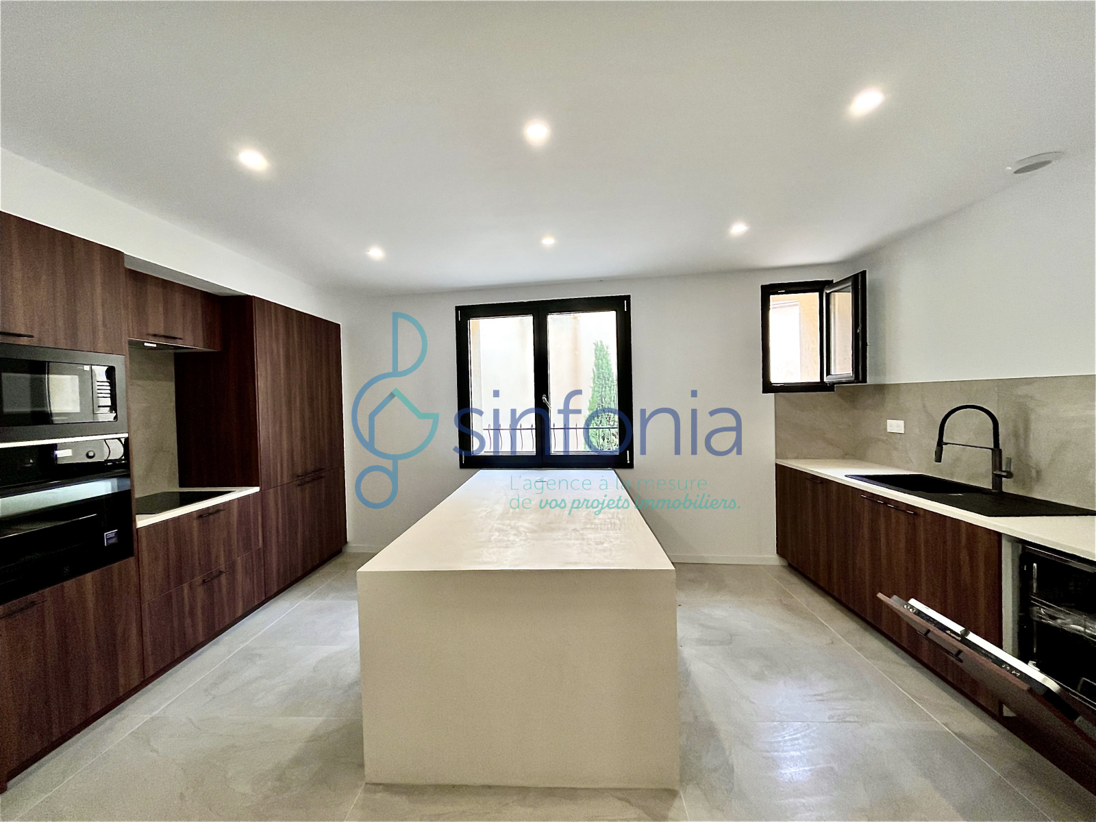 Sa composition. Au 1er étage. Buanderie. Toilette. Salon. Salle à manger et cuisine équipée contemporaine donnant sur la terrasse de 40M2 abritée. Au 2ème étage, 3 chambre, une sdetoilette.