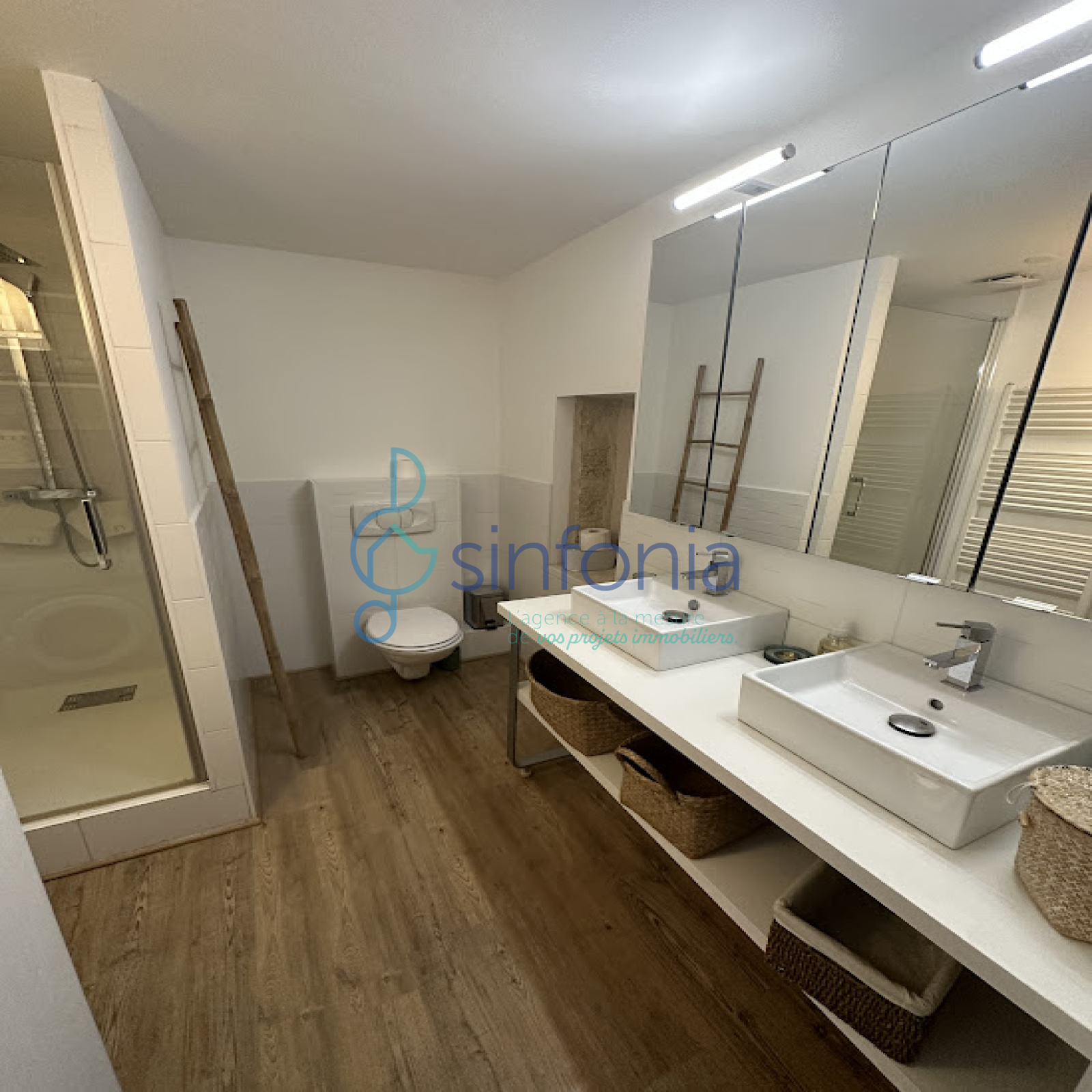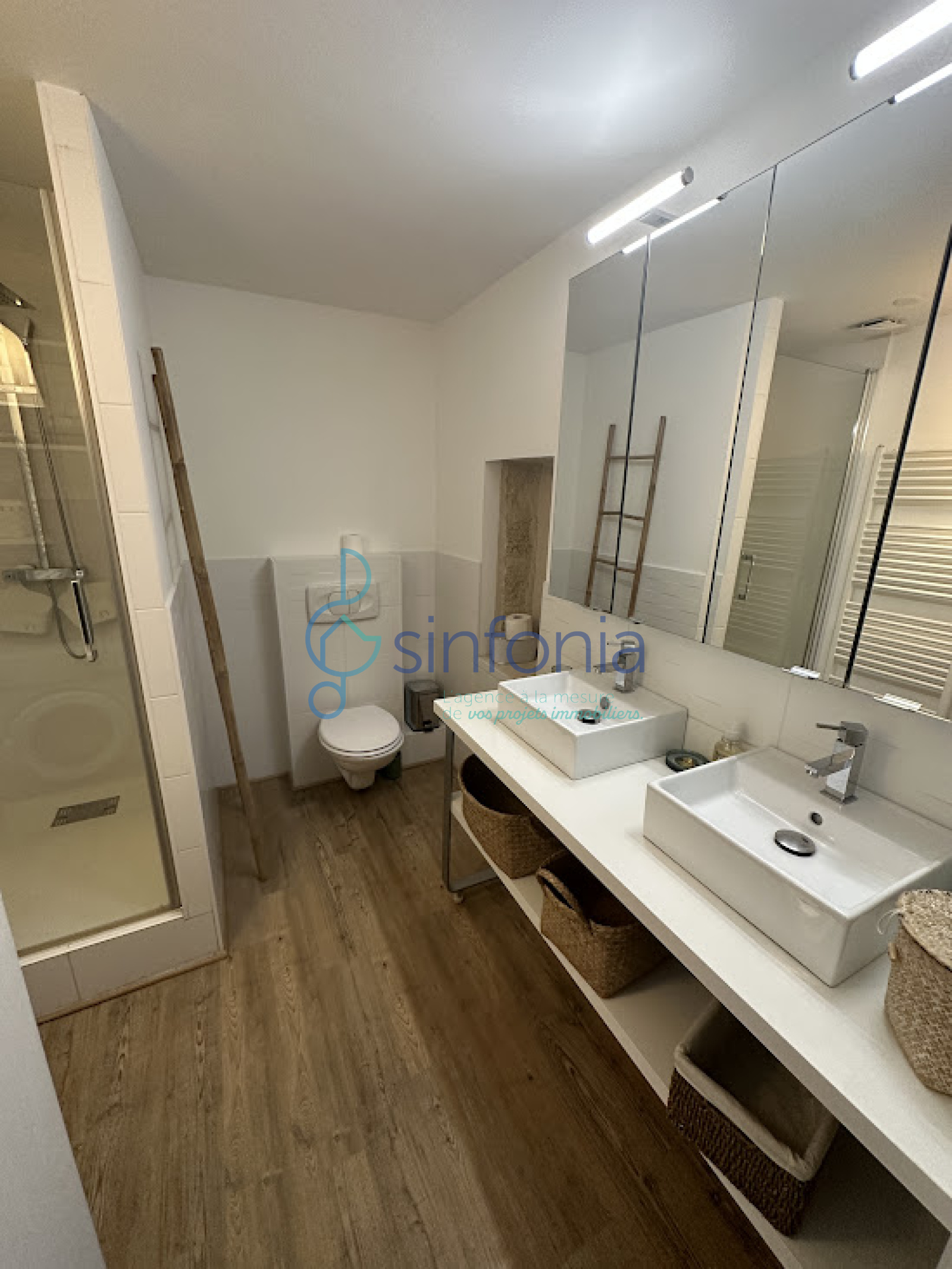 A l'étage: 2 chambres dont une cosy et une denviron 12 m2 avec grand placard; salle deau moderne avec double vasque.