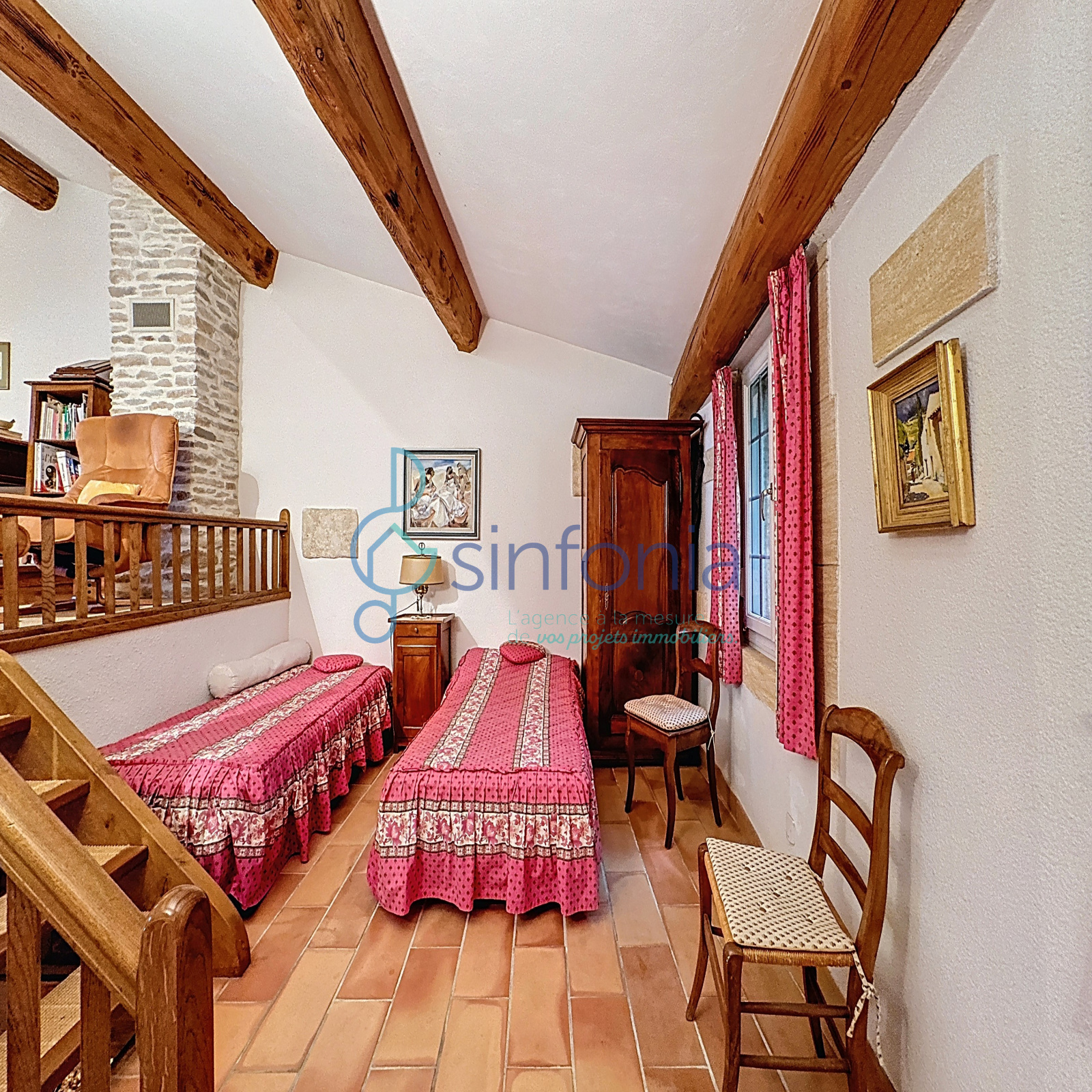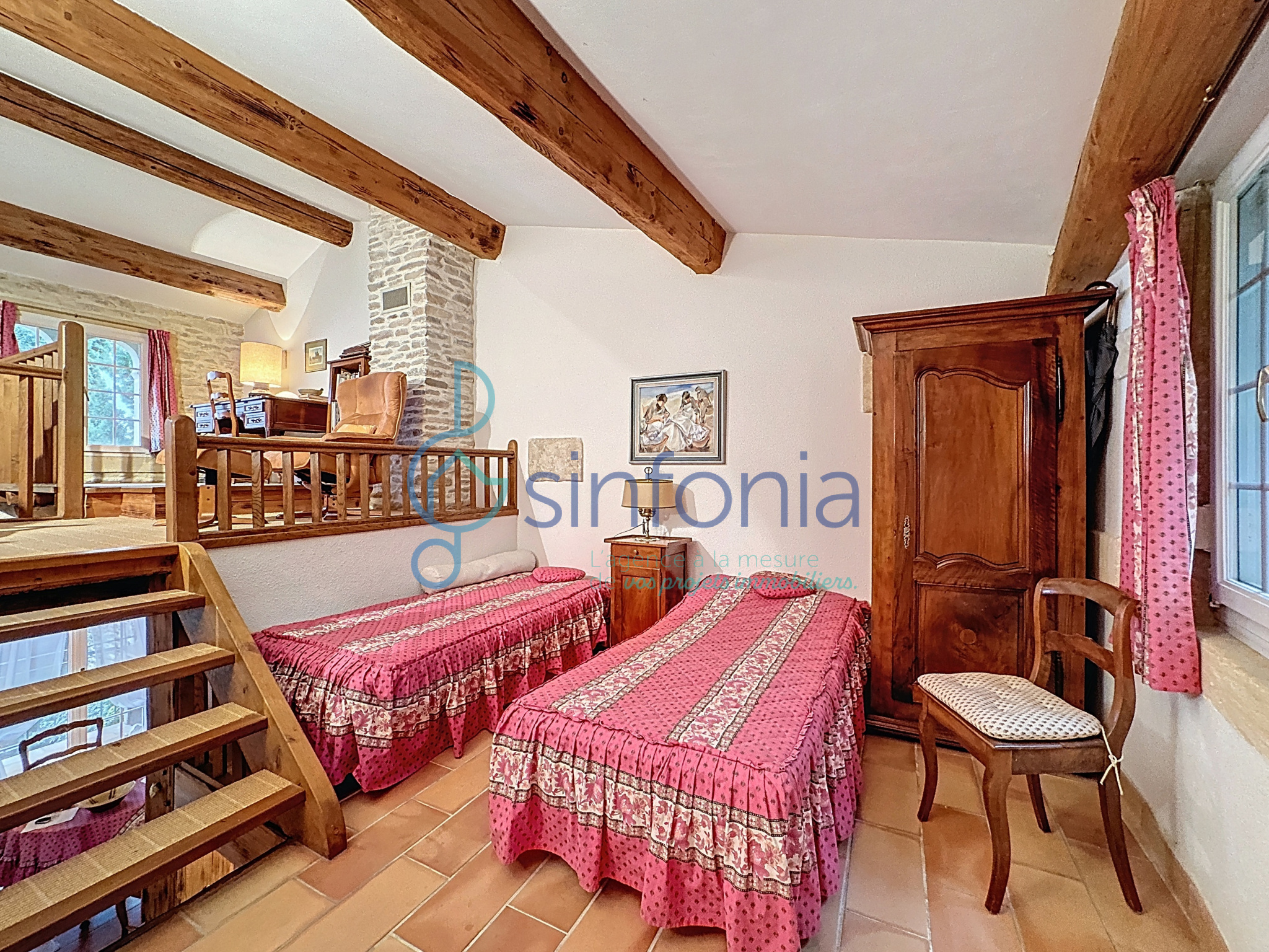 À l’étage, une chambre d’amis avec salle d’eau et WC s’ouvre sur une mezzanine pouvant accueillir un espace bureau ou un coin lecture.