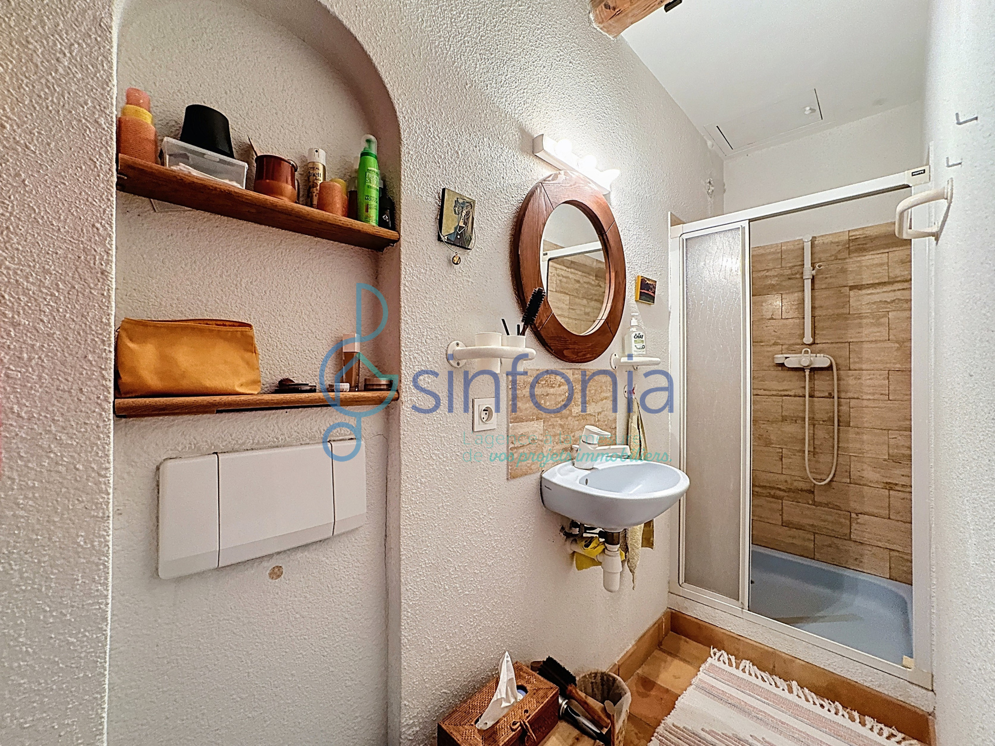 Le rez-supérieur accueille les pièces de vie. On y trouve un séjour et une salle à manger avec cheminée, une cuisine équipée, ainsi qu’une véranda climatisée prolongée par un balcon couvert avec barbecue. Un WC indépendant complète ce niveau. L’accès direct à une cour privative permettant le stationnement constitue un véritable atout pour un bien situé en cœur de village.