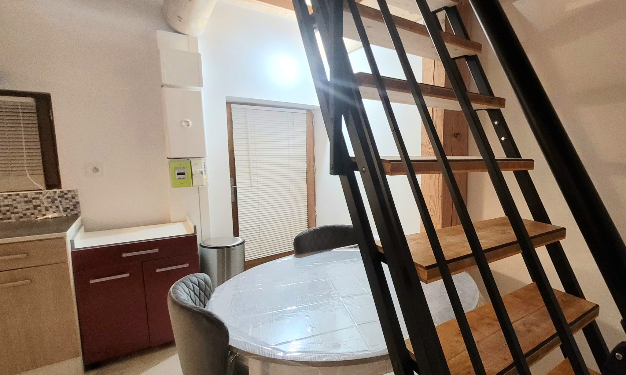 au rez-de-chaussée d'un salon/séjour/cuisine de 16,41 m² , 1 étage : d'une chambre, d'une salle d'eau moderne et au 2 étage : d'une chambre mansardée au dernier niveau.