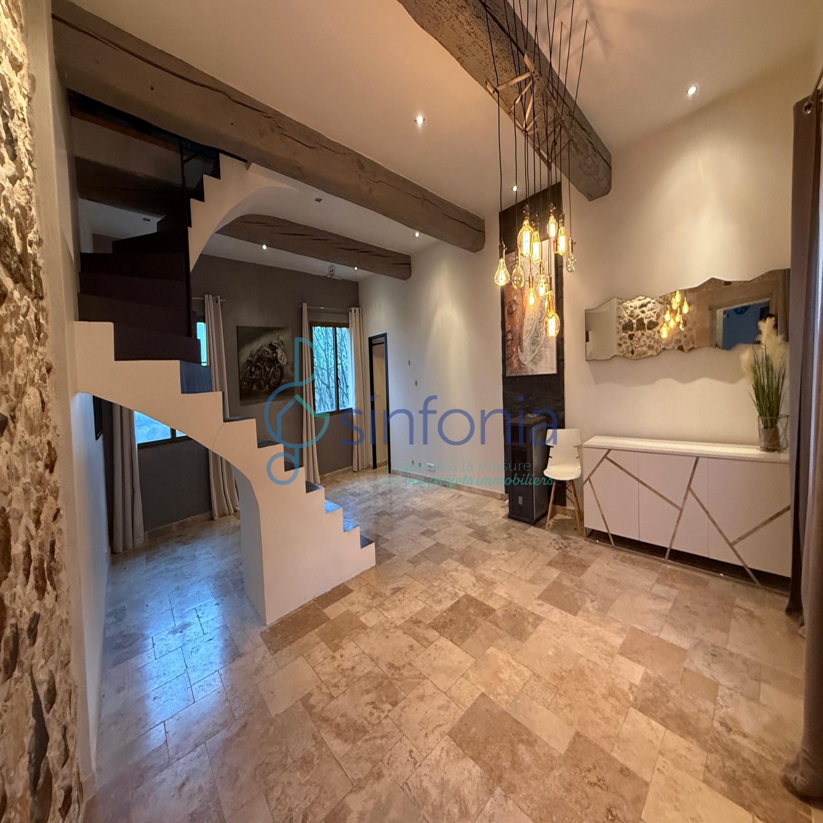 L’habitation principale, développant environ 172 m² sur deux niveaux, a fait l’objet d’une rénovation soignée alliant noblesse des matériaux et confort contemporain. Au premier étage, une terrasse extérieur nous acceuille, un hall d’entrée distribue harmonieusement une cuisine équipée, un séjour lumineux proposant une agréable vue sur le village, une chambre et une salle d’eau, le tout structuré par un élégant escalier central et des sols en travertin.