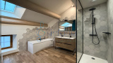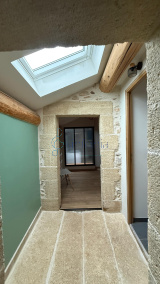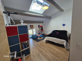 Le rez-de-chaussée propose un appartement indépendant d’environ 90 m² comprenant deux chambres et une vaste pièce de vie de 43 m² sublimée par un sol en travertin, des murs en pierre apparente et des matériaux de qualité. Une cave en sous-sol, intégrée sous verrière et à finaliser, renforce le cachet de l’ensemble. Les fenêtres offrent également une agréable vue sur le village, ajoutant charme et luminosité à cet espace qui se prête idéalement à une activité de location saisonnière ou à l’accueil de proches en toute autonomie.