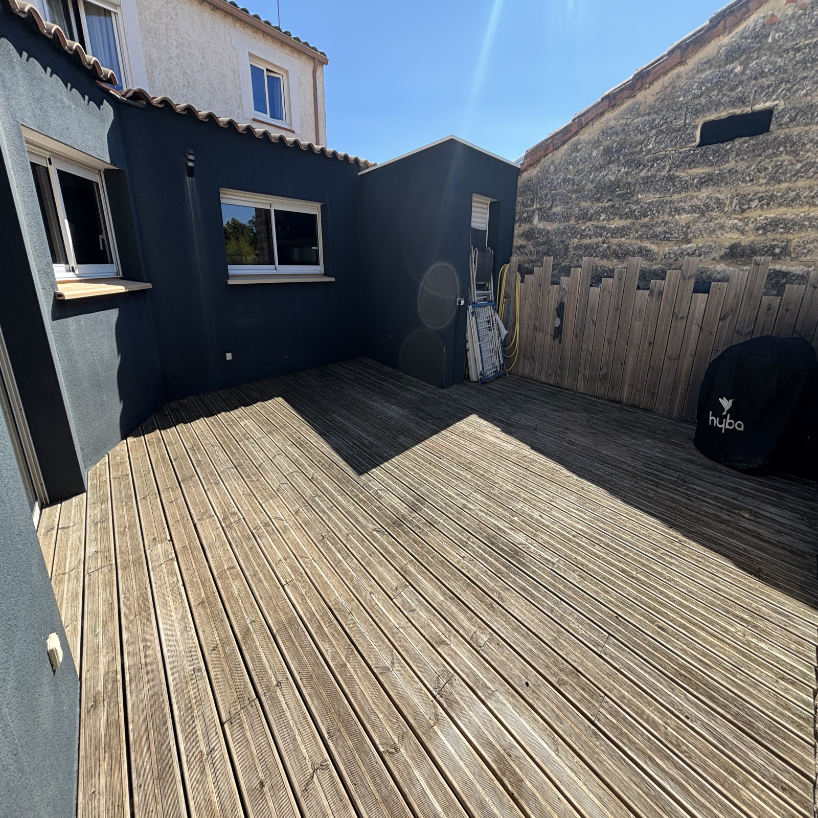 À l’extérieur, une terrasse en bois de 40 m² où l’on entend chanter l’été, une grande cour pour partager des repas à rallonge, et une place de stationnement complètent ce bien rare.